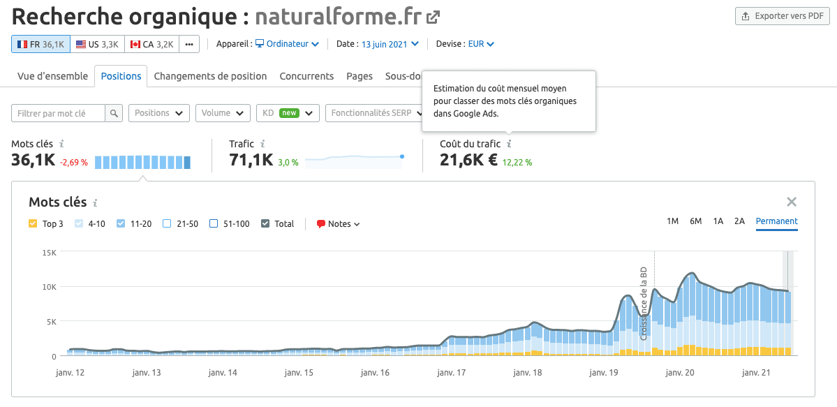 - le e-commerçant aurait dû dépenser 21 000 euros en publicité (achat de mots-clés) pour attirer le même trafic sur un mois.